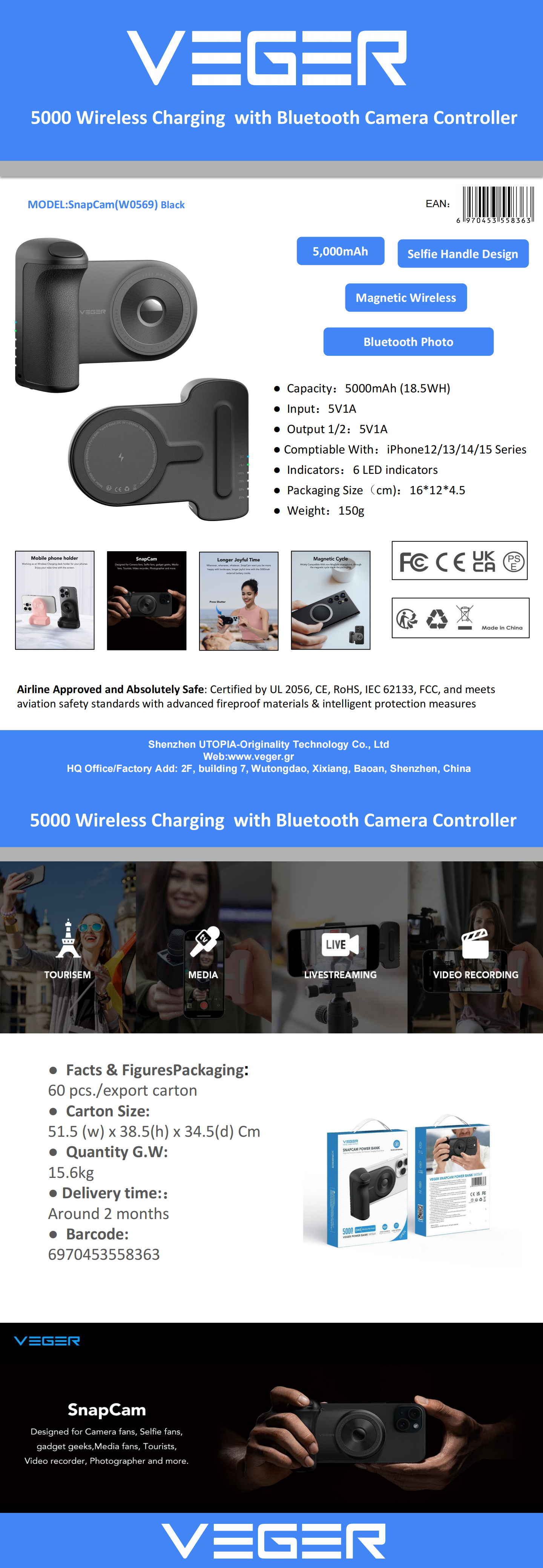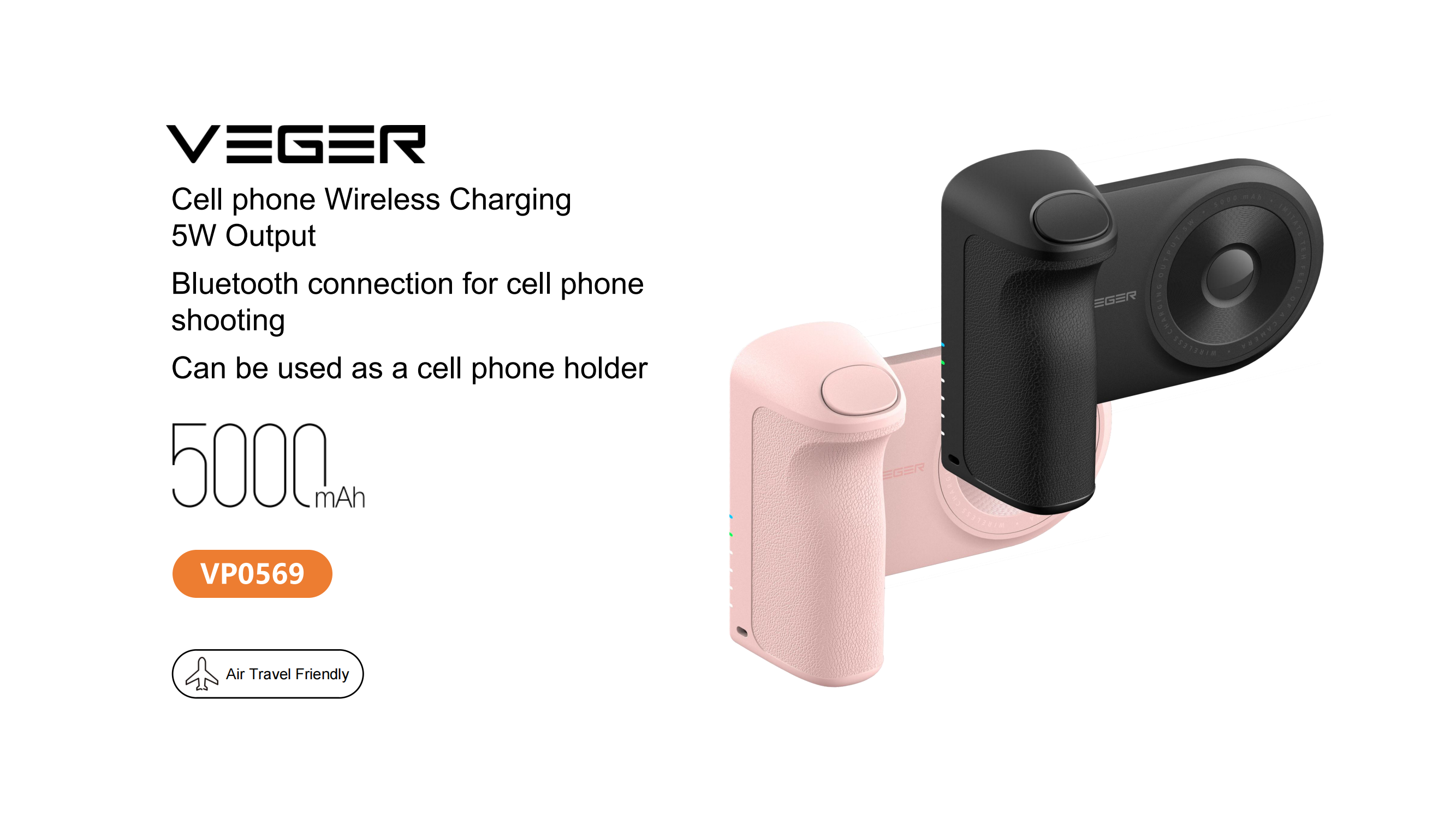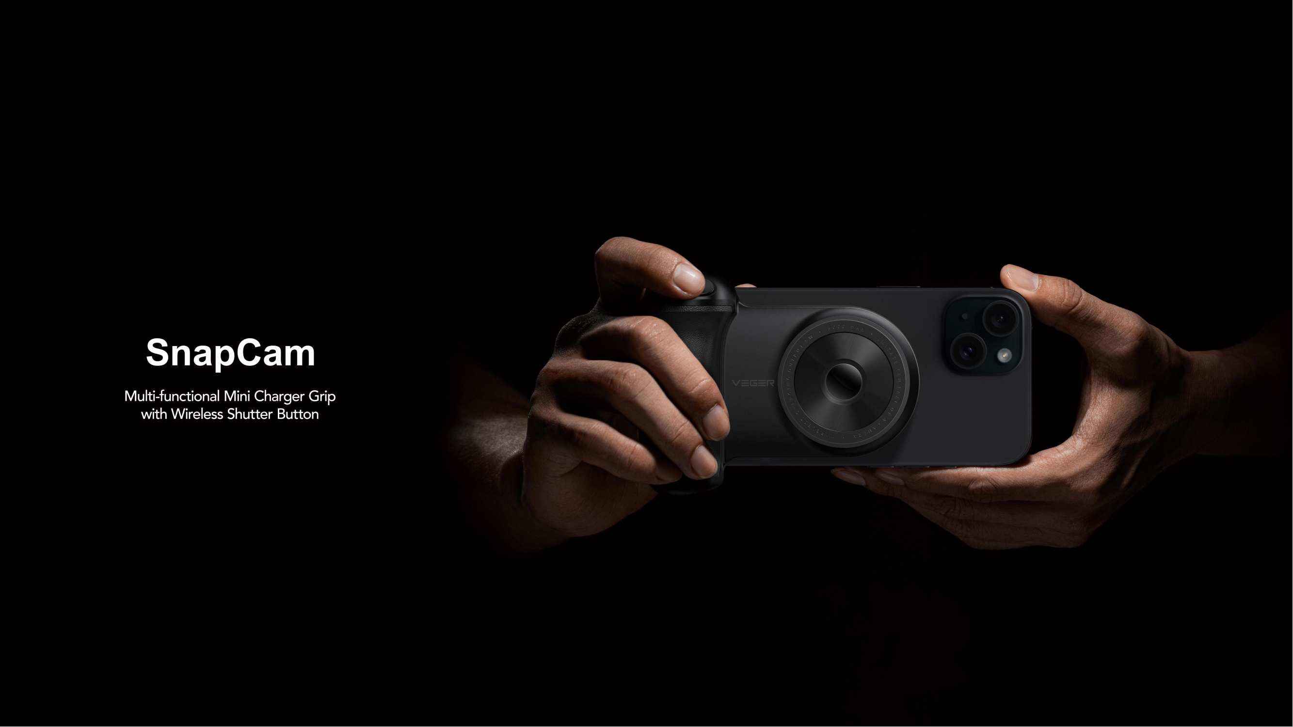 Veger W0569 SnapCam 5000mAh Wireless Charging Power Bank with Bluetooth Camera Controller-Black