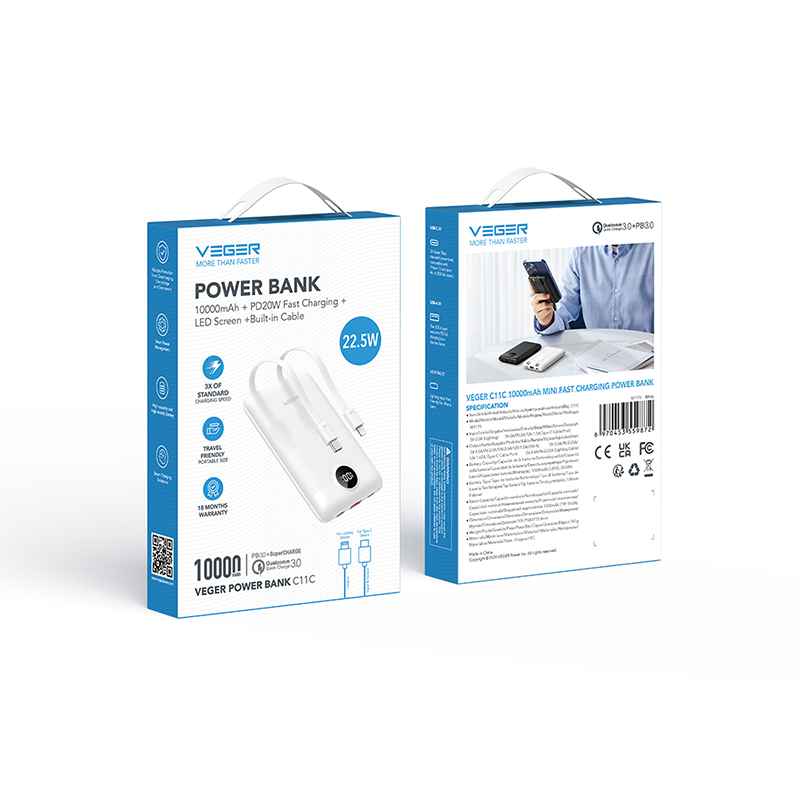 Veger C11C - 10,000mAh 22.5W PD Digital Display Light Weight Powerbank With Built In Non-MFI Lightning & USB-C Cable Λευκό