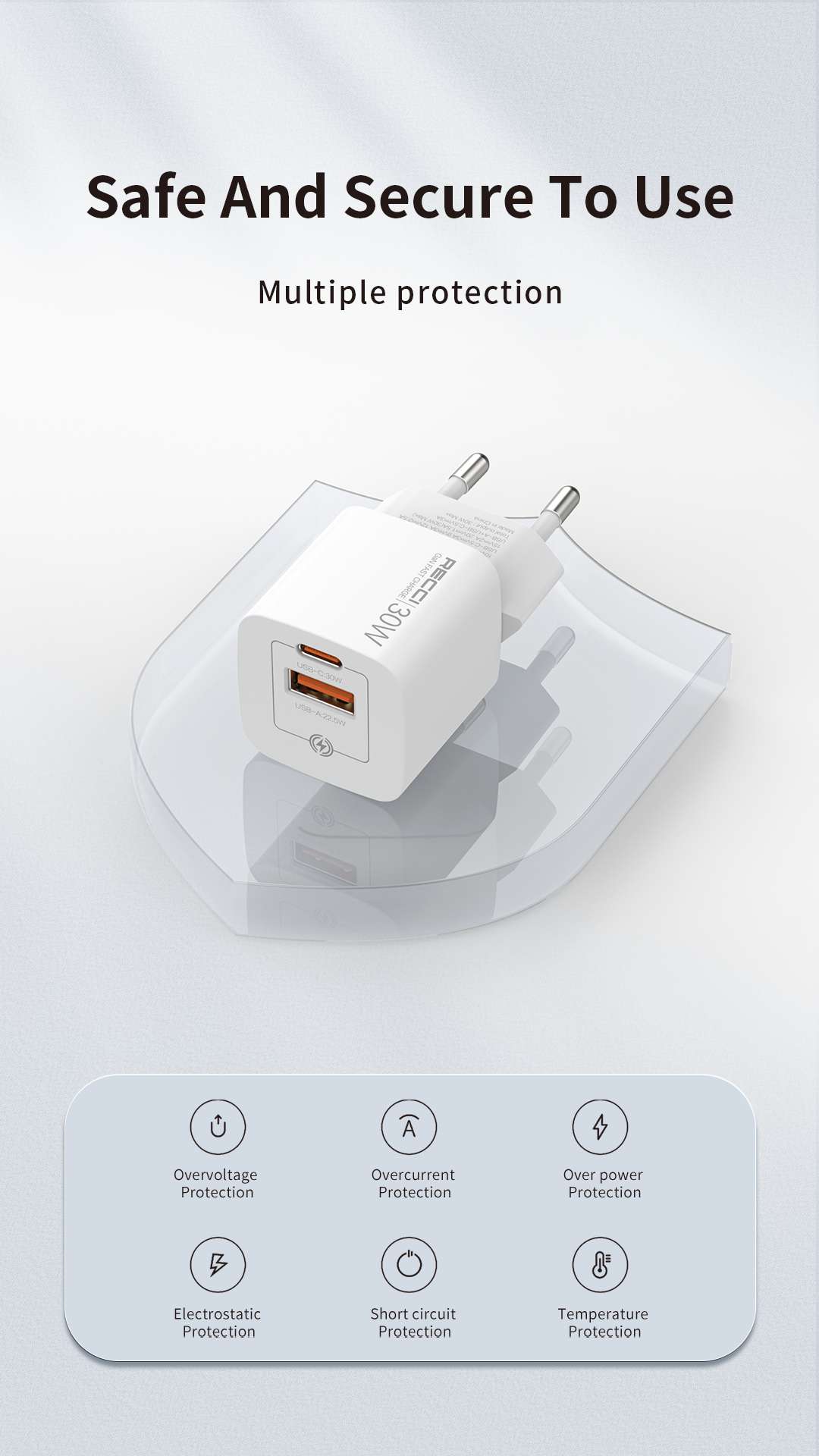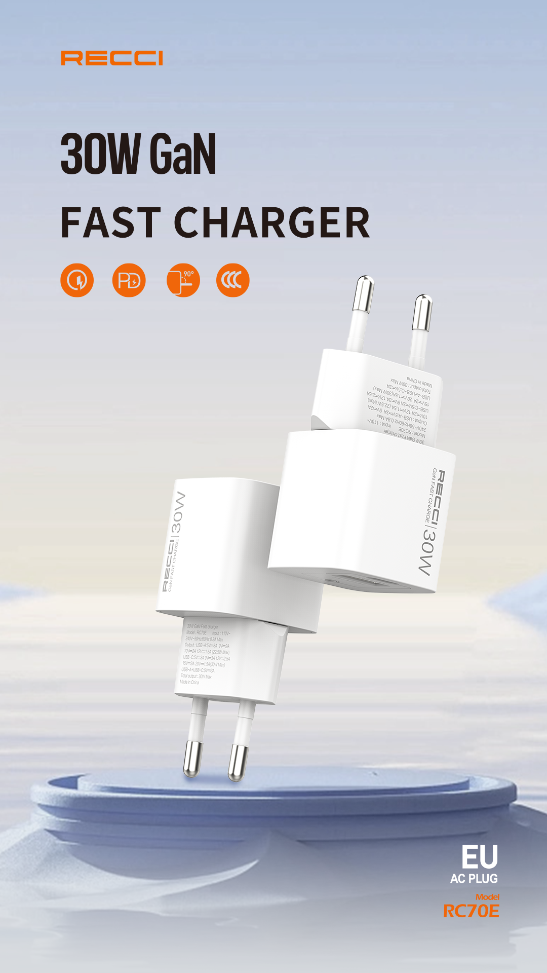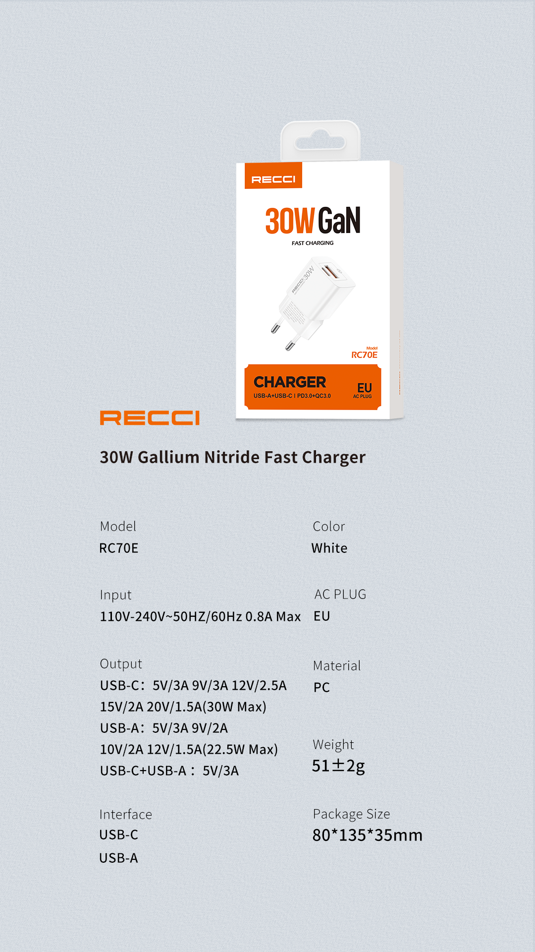 RECCI RC70E - 30WGaN Fast Charging USB-C + USB-A Output Port PD3.0|QC3.0 - White